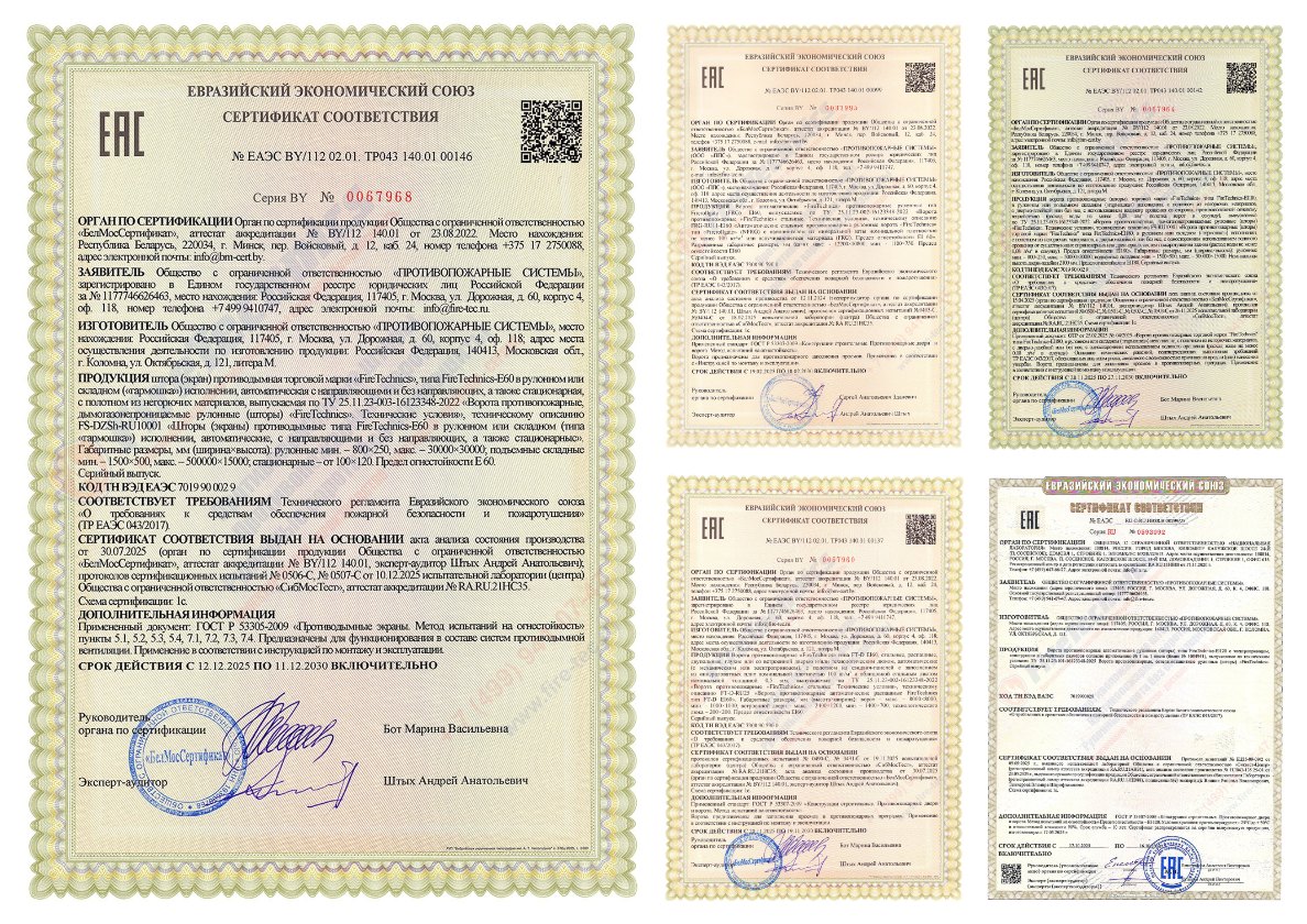 — Секционные противопожарные ворота FireTechnics-S EI60 с калиткой— Противопожарные шторы FireTechnics EI60 без орошения водой |